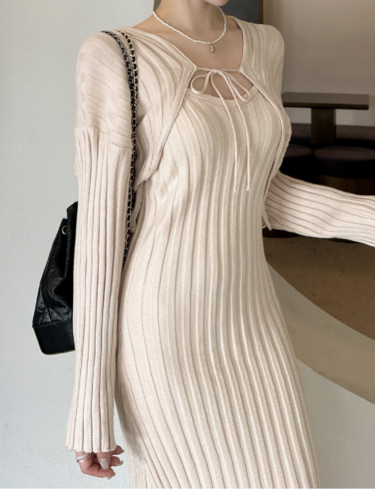 md comment 볼레로 디자인의 가디건과 슬림한 핏의 롱 나시 골지 니트 원피스 세트에요! 신축성 좋은 소재...
