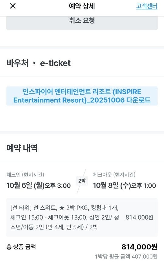 25.10.06~08 인스파이어 2박3일 예약내역 예약일정 10월6일~8일(2박3일) 예약룸 선타워]선스위트 킹침대1 ...