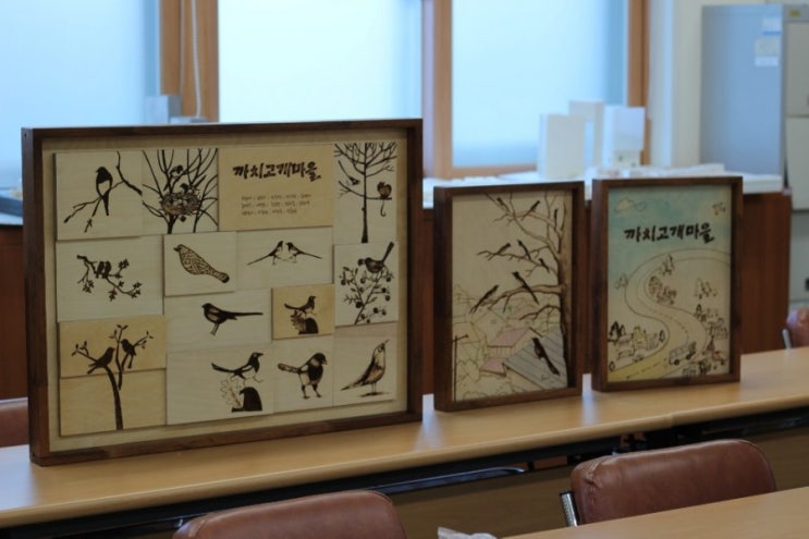 #도시재생프로젝트 #까치고개마을 우드버닝 수업이 끝났습니다. 한 조각씩 태운 까치 조각들로 공동작품도 ...