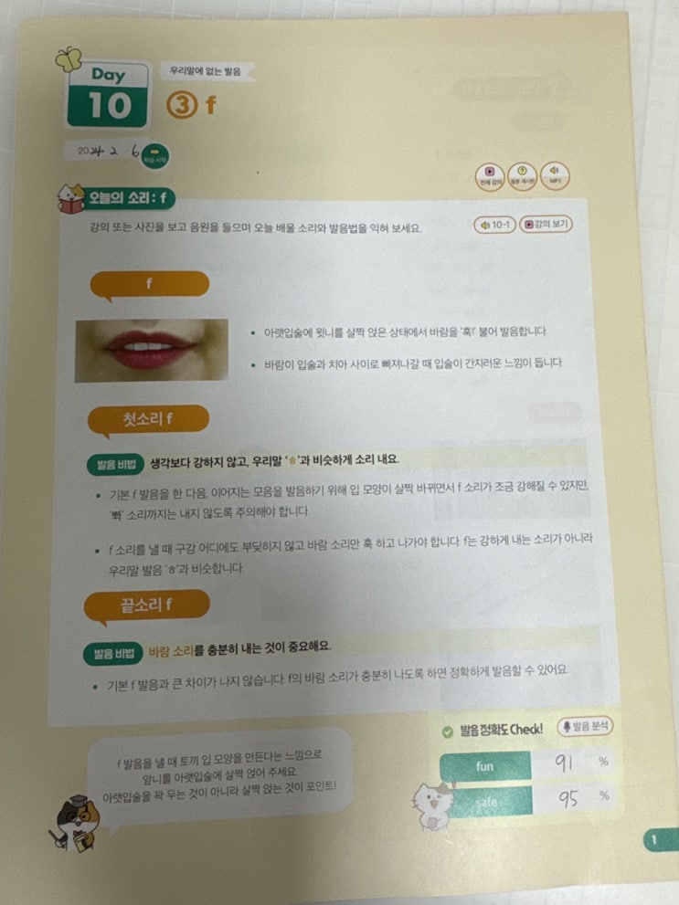 진짜 학습지 DAY10 기초발음 우리 말에 없는 발음 f 우리말 ㅎ 과 비슷하게 소리 내기 바람소리를 충분...