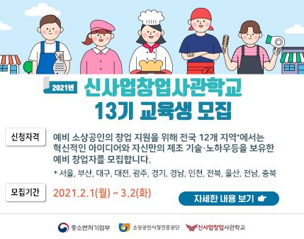 2021년도 신사업창업사관학교 13기 교육생 모집 공고가 떴다. 취업도 어렵고, 창업도 어려운 시기이지만......