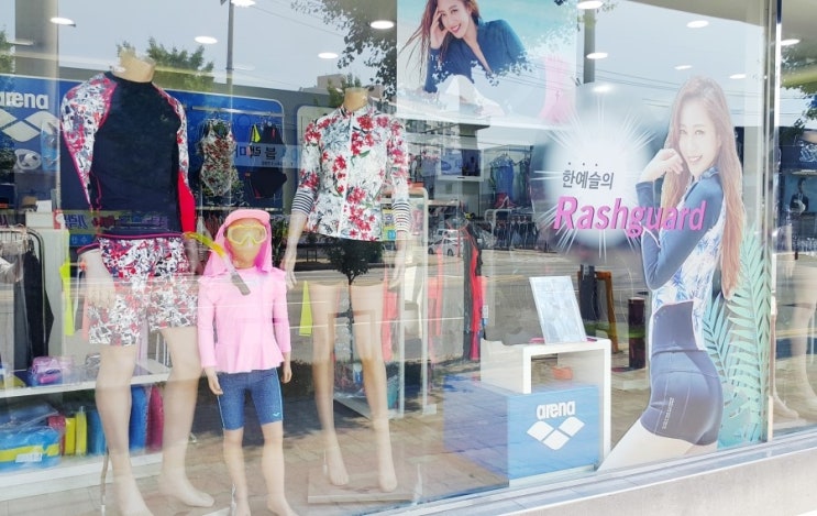 여름을 맞이하는 청주 내덕점의 새로운 매장 진열! 신상 래쉬가드 및 올 트렌드