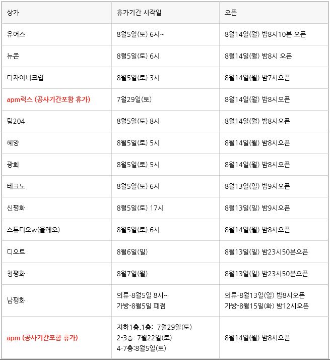 동대문 에이피엠 apm럭스 여름휴가및 공사기간