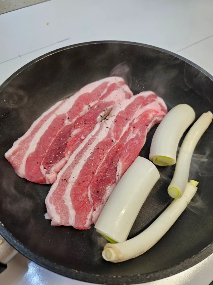 봄방학 시작했습니다 아침식사로 돼지고기 pick 삼겹살과 목살 굽굽했습니다 청소년12~18세 하루 육류 권장...