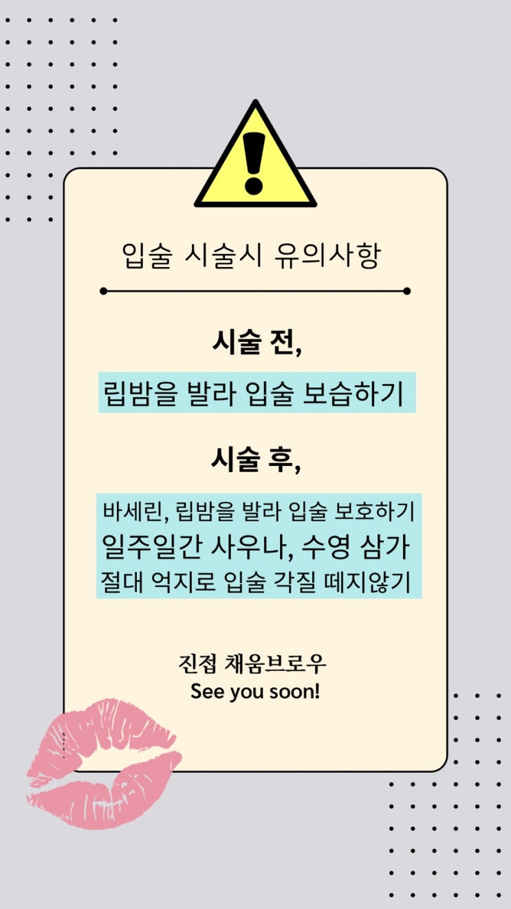 안녕하세요. 입술 문신 시 유의사항을 알려드립니다. 시술 전 유의사항을 꼭 확인하시어 건강하고 아름다운...