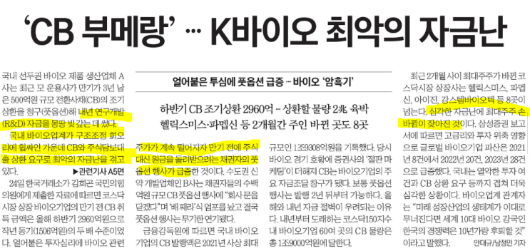 코로나로 인해 호황을 맞았던 2021년 바이오기업 CB가 부메랑이 되어 돌아오고 있음. 주가가 계속 떨어지...