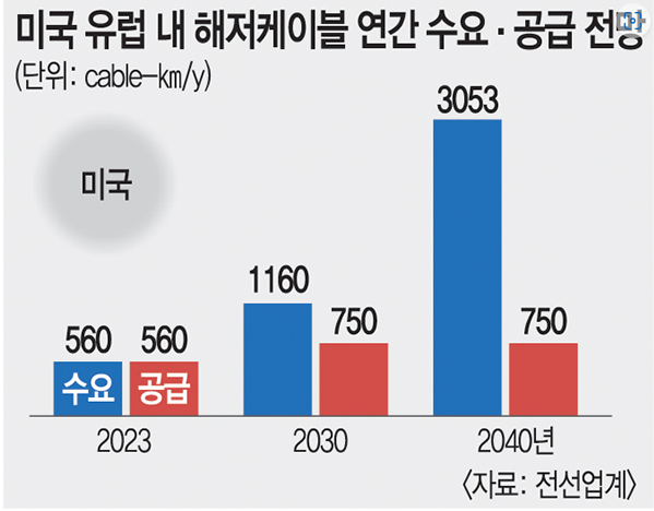 24일 전선 업계에 따르면 2040년까지 미국·유럽 내 초고압 송전용 해저케이블 수요·공급 격차는 지속해서 ...