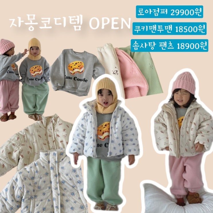 #자몽코디템 오픈이요!! 로아점퍼 29900원 쿠키맨투맨 18500원 솜사탕 팬츠 18900원 로아점퍼 꽃무늬랑 곰...