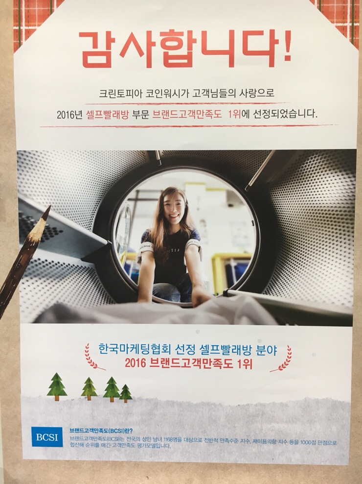 크린토피아 코인워시가 브랜드 고객만족도 1위를 했어여~~ 뭐뭐 우리 평택...