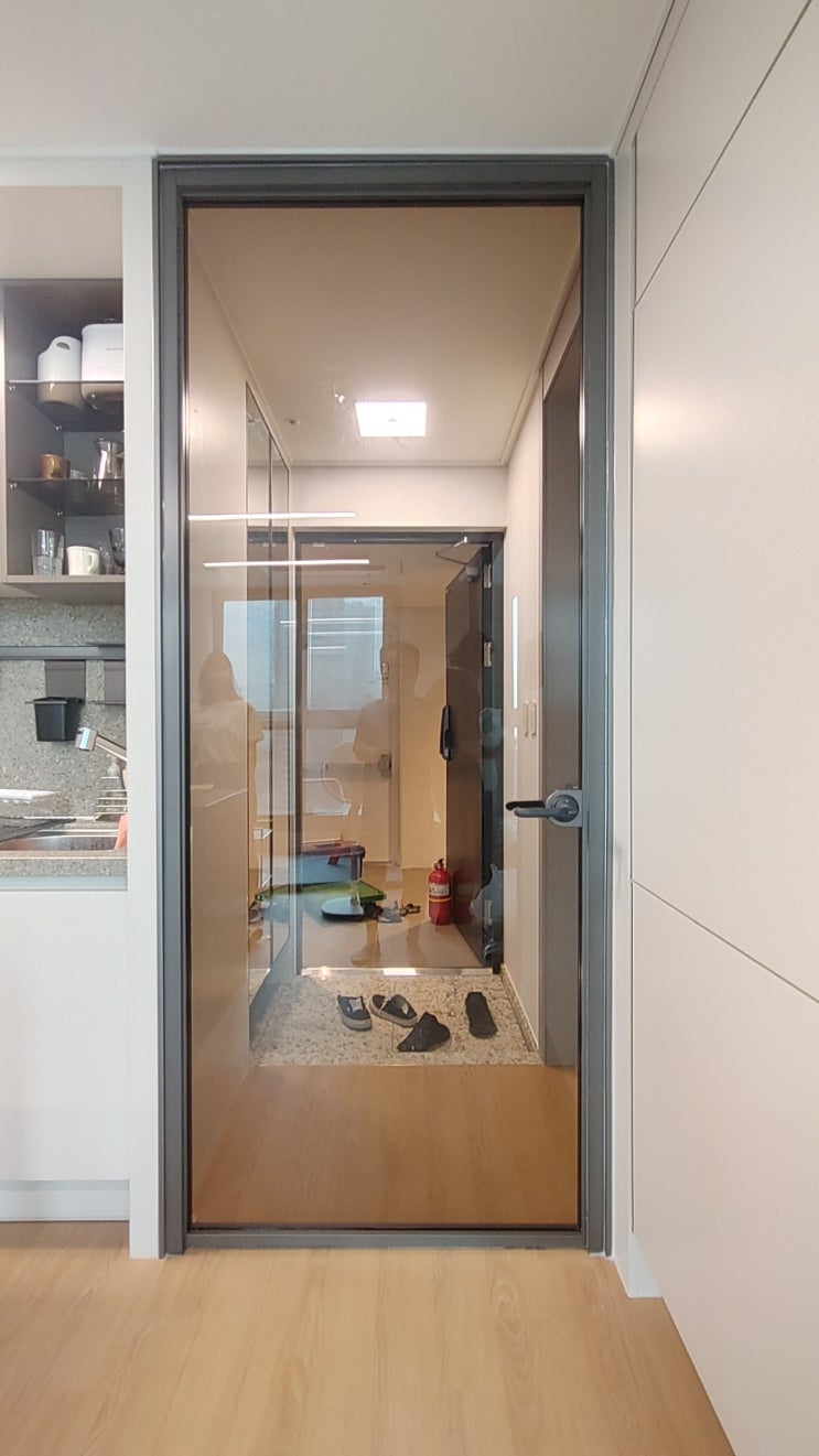 좁은 현관 입구 초슬림 ㄱ자 3연동중문 시공 강남 신축빌라에서