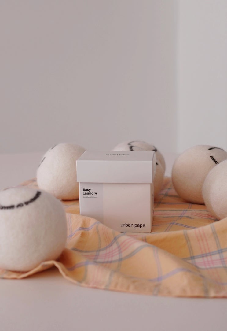 어반파파 이지런드리 친환경 세탁세제 그리고 양모 건조기볼 소개합니다. 세탁세제는 태블릿형이에요. 덕분...
