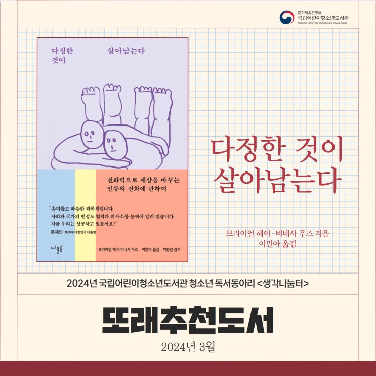정보 제목 : 다정한 것이 살아남는다 저자 : 브라이언 헤어, 버네사 우즈 번역 : 이민아 출판 : 디플롯 정...