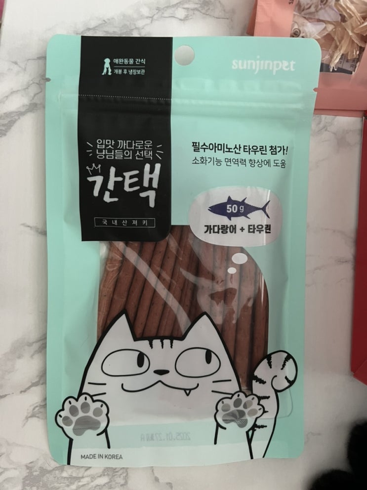 고양이간식 이름이 "간택" 너무 귀엽죠? ㅋㅋ made in korea 간식이고요, 포장 앞 뒤 고양이 디...